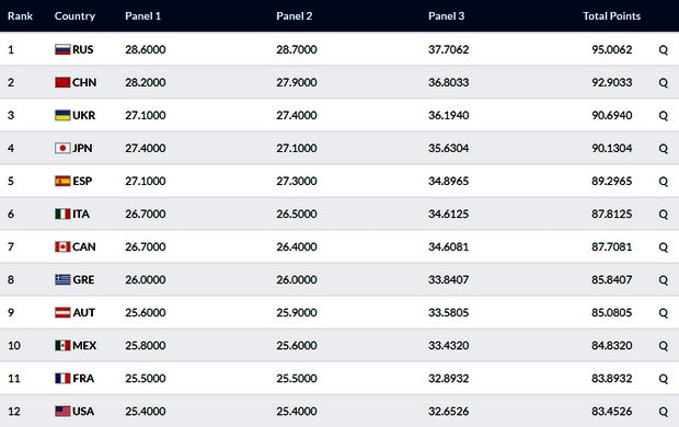 Οι Ελληνίδες πρωταθλήτριες Ευαγγελία Πλατανιώτη και Εβελίνα Παπάζογλου εκτέλεσαν με σωστή τεχνική και αρμονία το πρόγραμμά τους και βαθμολογήθηκαν με 85,8407 β., βαθμολογία που τις κατέταξε 8ες ανάμεσα σε 40 Ντουέτα που έλαβαν μέρος στον Προκριματικό, άφησαν πίσω τους μεγάλες δυνάμεις του αθλήματος (Μεξικό, Γαλλία, ΗΠΑ) και προκρίθηκαν στον Τελικό όπου μετέχουν τα 12 καλύτερα Ντουέτα. Ο Τελικός είναι προγραμματισμένος για την Κυριακή (16/7) στις 12 το μεσημέρι (ώρα Ελλάδας).